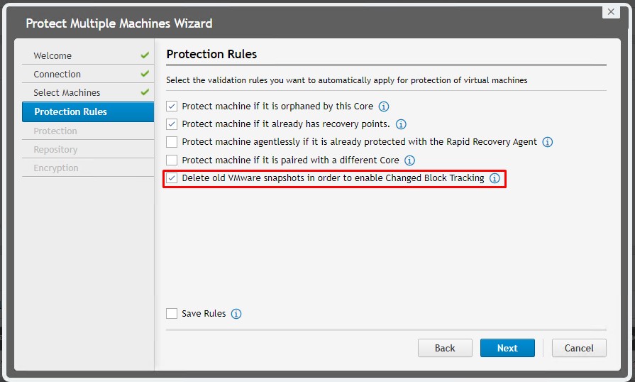 Selecting this option lets the Core, delete previous VMware snapshots, including snapshots created by a user or another program, if that is needed to enable CBT.