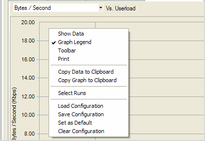 To modify a graph view, right-click a Benchmark Factory graph to display a drop-down list that allows you to customize graph settings. Whether you are viewing a real-time graph or one in Benchmark Factory Run Reports, Benchmark Factory uses the same graphing tool. In most cases you will find that the graphs are presented in the most meaningful form (Line Graphs or Bar Graphs based on the data being presented.)