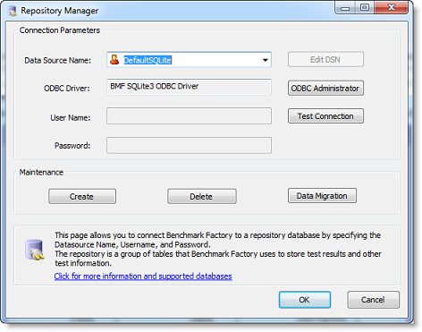 The Data Repository Migration Wizard allows you to migrate the Benchmark Factory testing repository from one database type to another. For example, from the default SQLite database to a Microsoft SQL Server database.