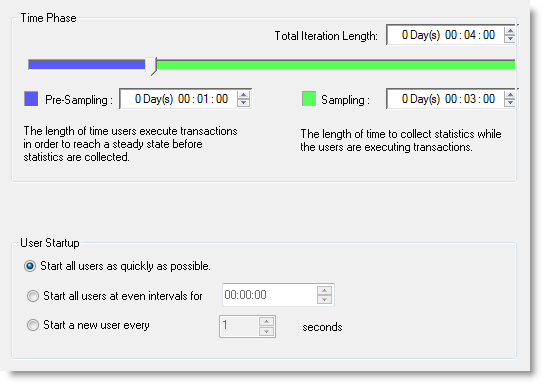 Sets the amount of time in which to start all users at even intervals. The interval duration is equal to this value divided by the number of users. |