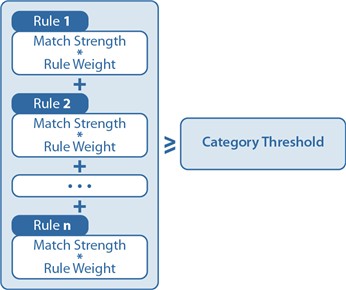 In the simple example provided in Rule Example Manipulating Threshold and Rule Weight, thresholds and rule weights started with simple values of 1, and then were increased or decreased depending on the number of rules for which you required a match. However, if you find this restrictive, you can use any range of numbers for your thresholds. Remember that you need to design your threshold so that your rule weights and the match strength of the rule will combine to trigger categorization. If you use a large number such as 100 for your threshold, for example to remove the need to use decimals in the match strength, ensure your match strengths and rule weights scale appropriately.