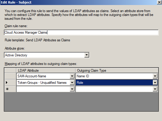 Select an LDAP Attribute of SAM-Account-Name and an Outgoing Claim Type of Name ID for the first claim mapping. This claim is required to identify the user to Cloud Access Manager.