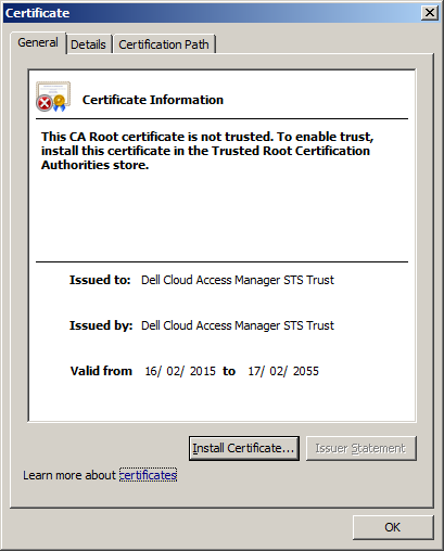 When the Security Warning dialog is displayed, confirm that the certificate is for Dell Cloud Access Manager STS Trust and click Yes.