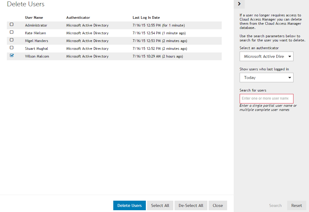You should try to be as specific as possible when you enter the search parameters to help reduce the number of search results found in the database. If you have multiple users that you want to delete, you can paste a comma separated list of complete user names into the Search for users field.