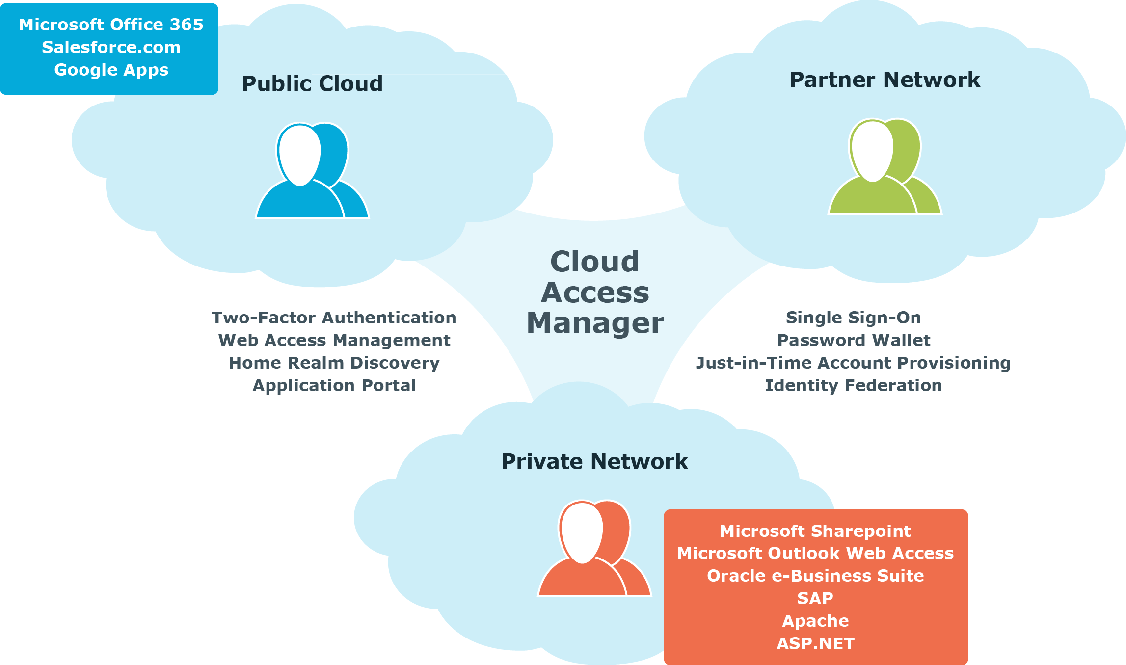 Cloud Access Manager is an identity bridge. It connects your users, your partners, and your customers to the applications they need.