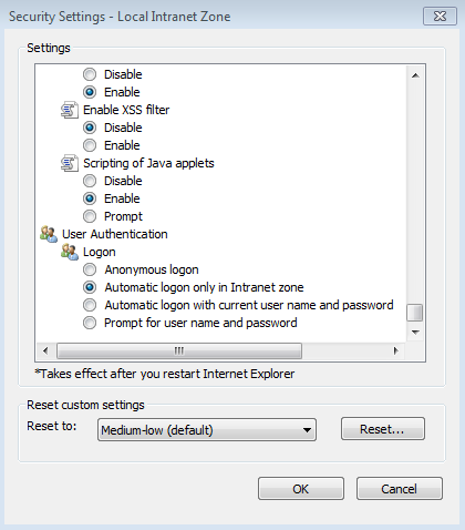 Next, click Tools | Internet options | Security | Local Intranet | Custom level to verify that the local Intranet zone has the default logon option of Automatic logon only in Intranet zone selected.