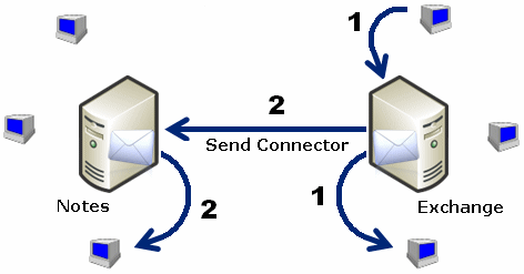 Message sent from native Exchange user to Notes user. Two possibilities: The Notes user either is represented in Active Directory as an external contact, or is simply unknown to Exchange. In the first case, Exchange finds a forwarding address associated with the contact ("targetaddress" attribute in AD), and sends the message via the Send Connector to Domino, where it is delivered to the appropriate mail file. In the second case, the message is still routed to Notes via the Send Connector, but Notes will be able to deliver it only if the appropriate mail file exists.