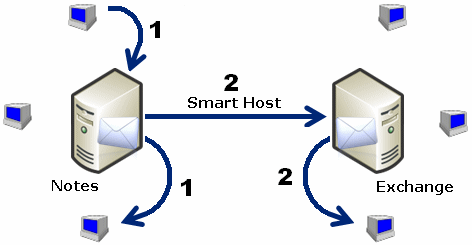 Message sent from native Notes user to Exchange user. Two possibilities: The Exchange user either is unknown to Notes, or is represented in Notes only by a person document. In either case, Notes cannot find a local mail file for the recipient, so routes the message to the smart host for relay to Exchange, where a recipient lookup permits delivery to the appropriate mailbox. If the recipient is present in the Domino directory, then Notes found the forwarding address in the contact document (mail system is also set to "Other Internet Mail") and sent it with the message to the smart host.