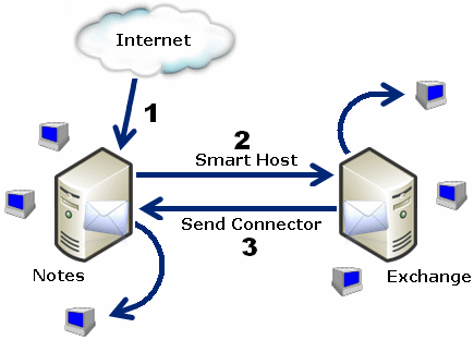 Inbound traffic is routed to Notes first in this example, but could just as easily be routed to Exchange first.