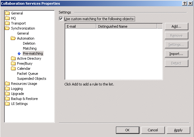 | • | Click Import to import a list of pre-matching rules from a text file. The file should contain a list of pairs, one pair per line. Each pair must include the email address of the published object and the distinguished name (DN) of the object to match into, separated by a space. |