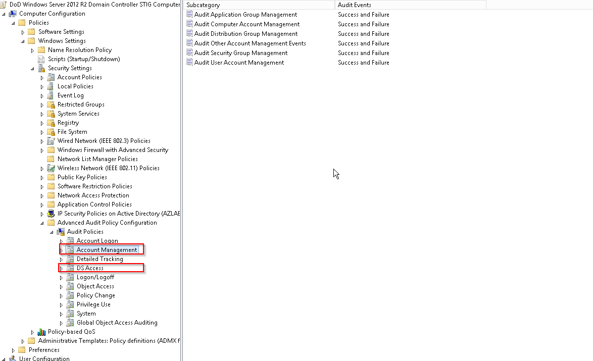 By default, Success and failure auditing of account management must enabled for both source and target domains via local security policy or GPO.  However, because “Audit: Force audit policy subcategory settings (Windows Vista or later) to override audit policy category settings” is enabled per STIG policy, additional audit policy settings must be configured for both source and target domains.