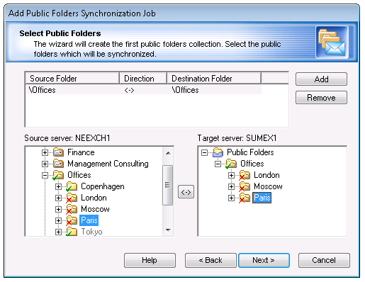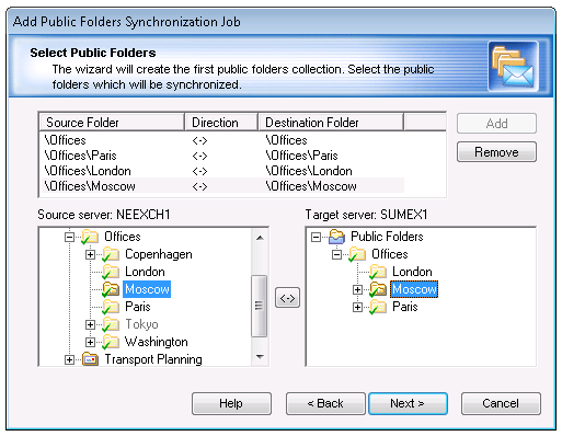 1. As you open the Add Public Folders Synchronization Job wizard, the target public folders created for each branch previously will be already displayed in the right pane.