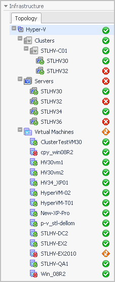 The Hyper-V Explorer Topology tab contains an organized view of the virtual infrastructure objects that are monitored by Foglight for Hyper-V: clusters, servers, and virtual machines.