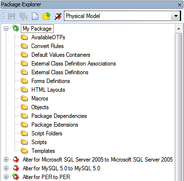 A package contains various means of customization such as scripts, macros, customized form definitions, data type conversion rules, etc. Packages affect models of various database platforms and versions depending on their Visibility and relations with other packages (Extension, Dependency).