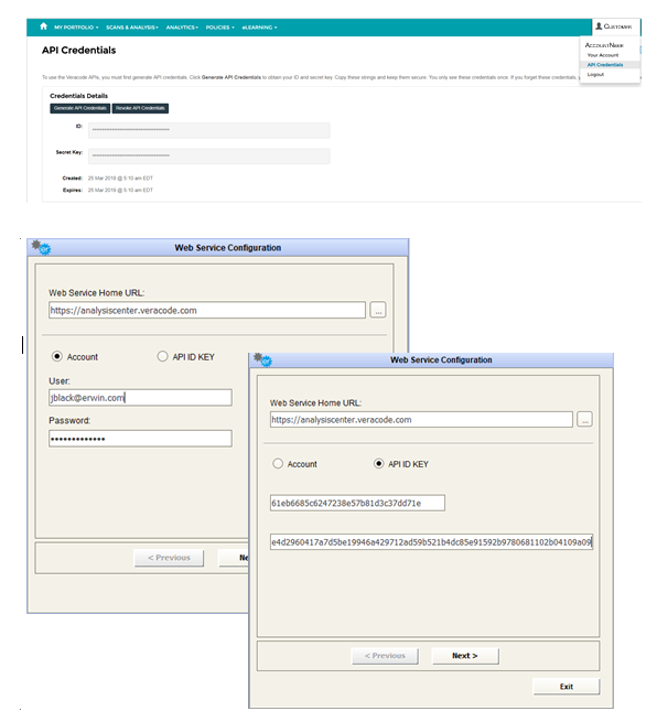 To use the adapter for Veracode, to import application data, fill the field “Web Service Home URL” with the Veracode URL you want to connect to. Then, provide a valid username/password to connect, or the API credentials (ID/KEY), that can be generated by a valid account.