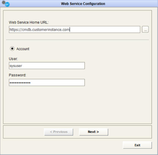 1.The field “Web Service Home URL” with the iTop instance URL you want to connect to. Then provide the username and password for a valid iTop Account, with grants to all the CI of interest.