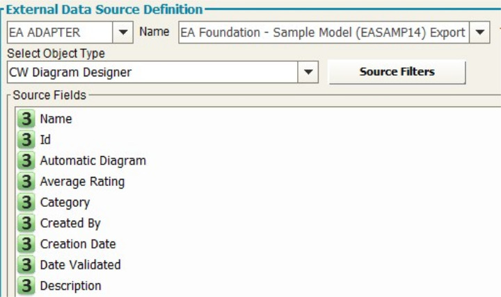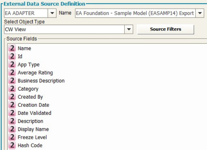 4. Add a second source EA Adapter and select the export adapter related to your source model: select CW View as object type and filter the following properties/associations: