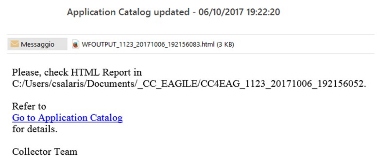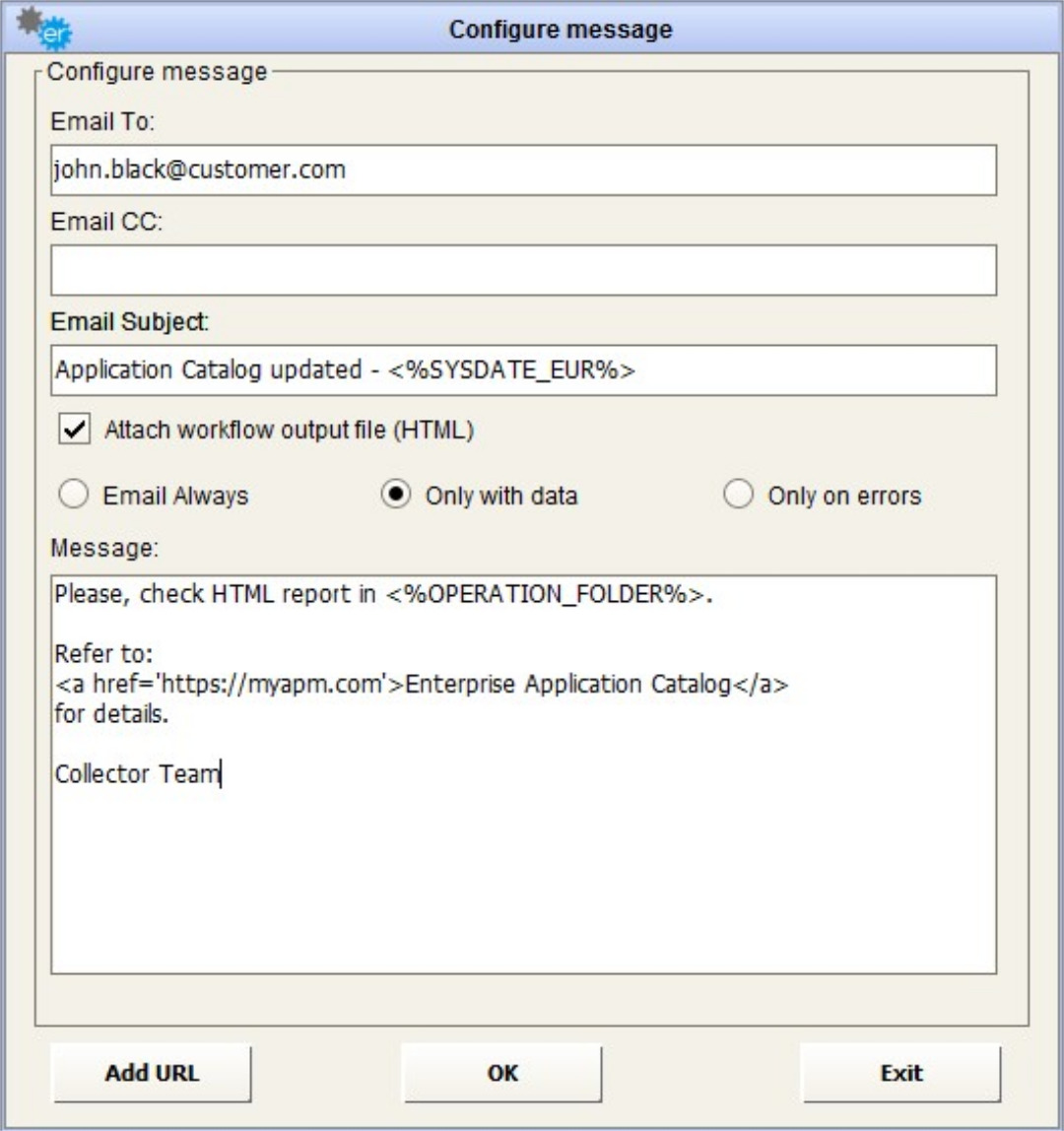 For instance if the first dataset of a workflow has a column named “1 AM email”, containing the application manager email related to the column “1 Application name”, a proper email recipient could be configured in the email as <%1 AM email %> and the subject of the message could be: