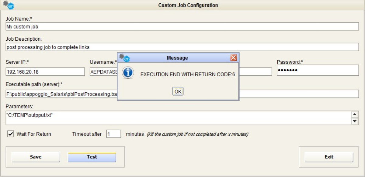 To configure a Custom Job, beside the Job Name and Description, the user must provide the environment information, such as the IP of the server in which the execution has to be launched, the username and password of a Windows account (as specified in the Windows domain) which has the grant to login to the server and run the execution.