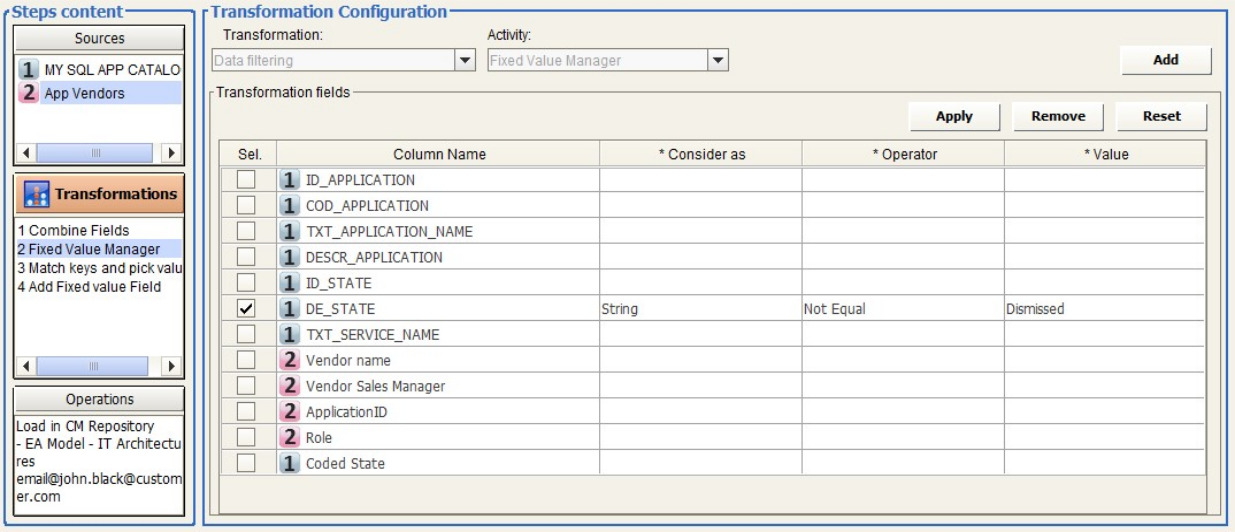 Please note that filters defined as the first transformation will be shown in source fiels list (see picture above) and executed at export time (if an EA Adapter is the source for filter fields)