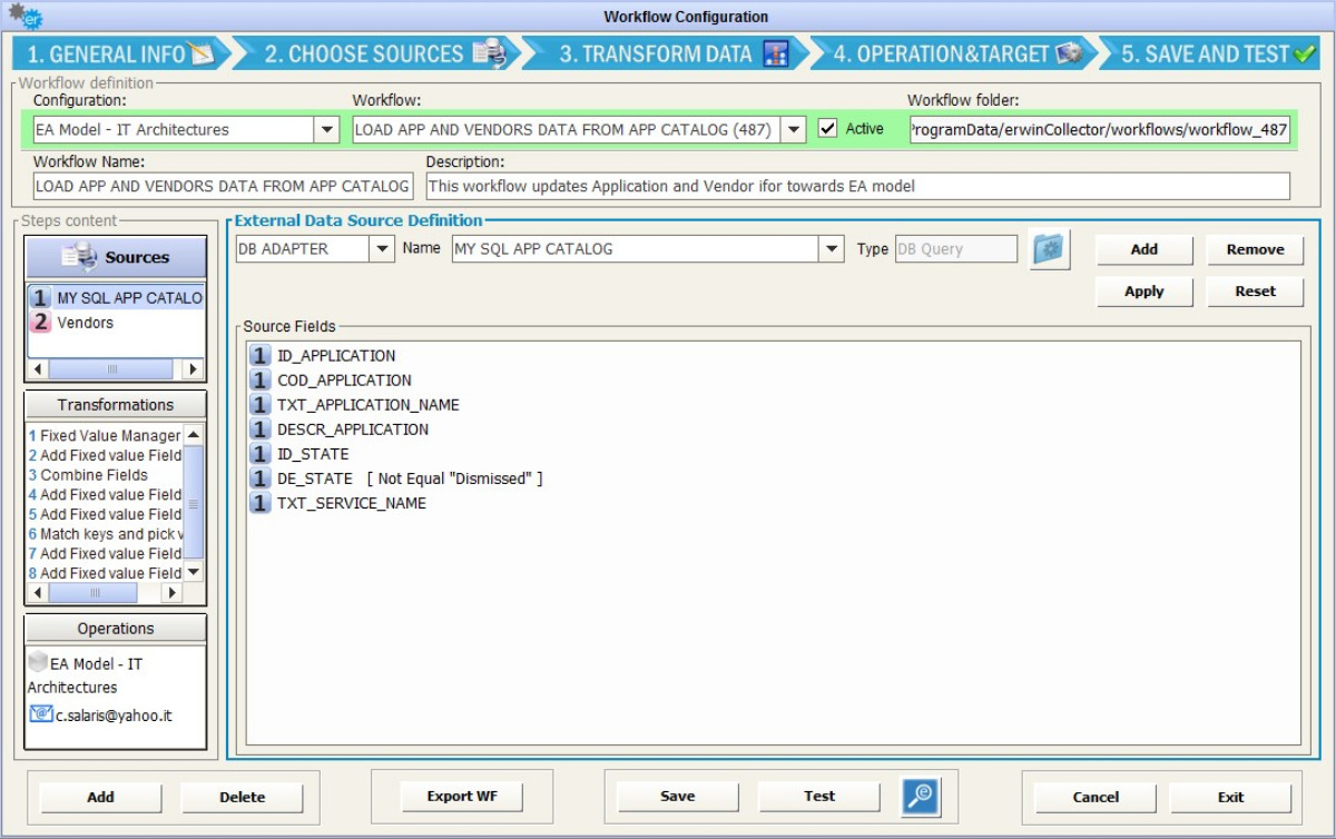 A DT workflow aligning Business Services data from Erwin to the Service Catalogue database can be configured with the following steps: