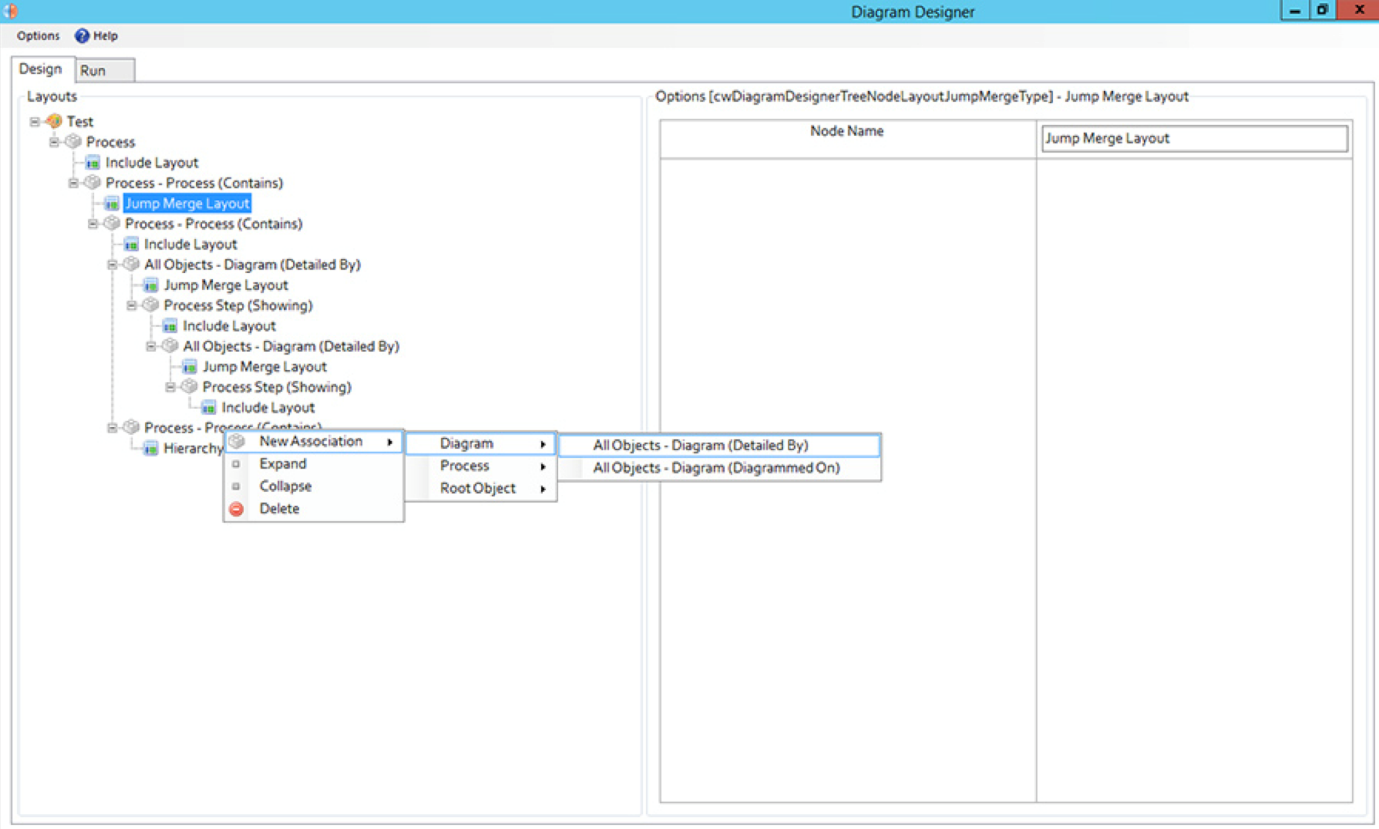 The only available layout for a Diagram Association is the “Jump & Merge”.