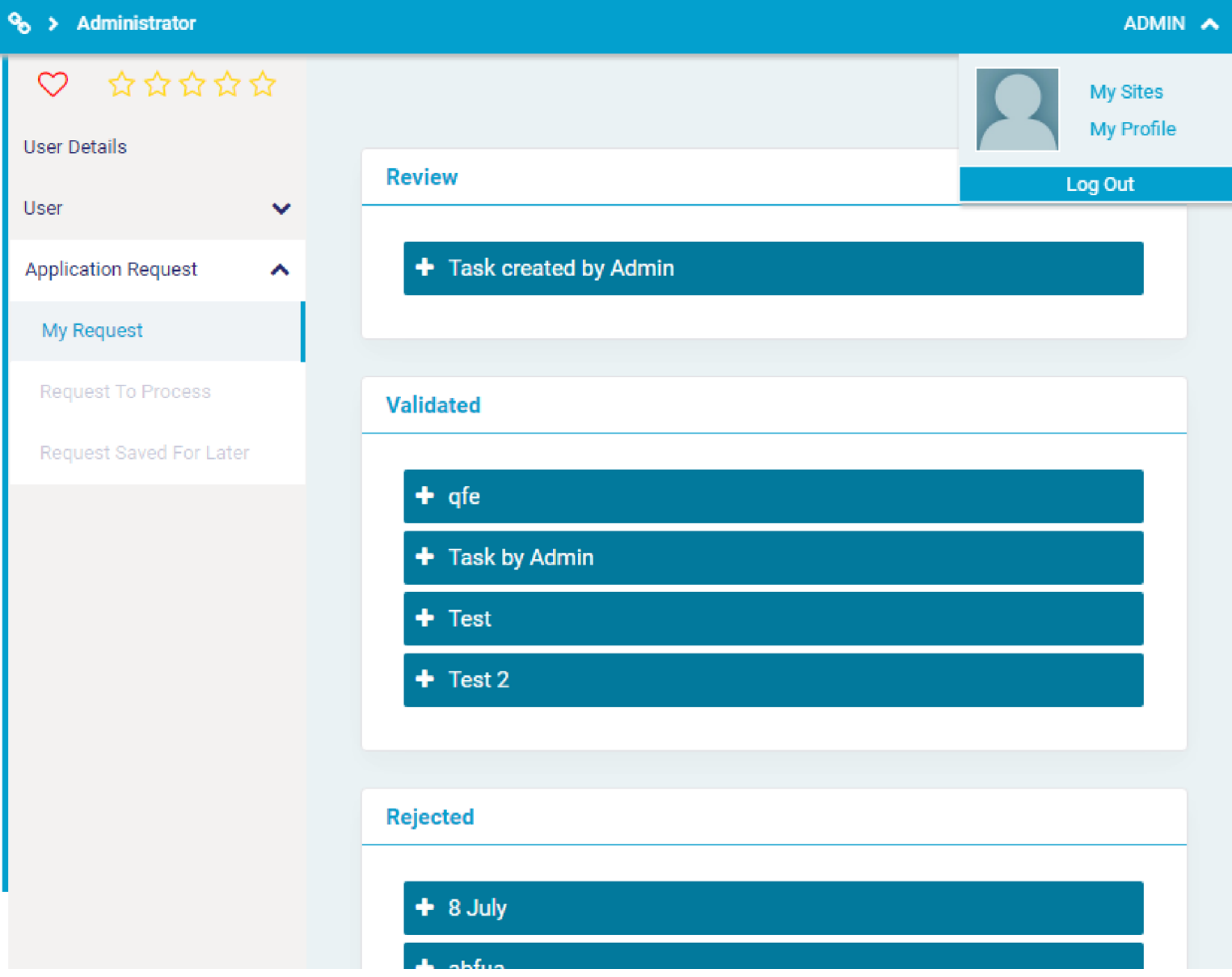 You can view the status of approval requests under ADMIN > My Profile > Application Request > My Request. (Additional configuration required.)