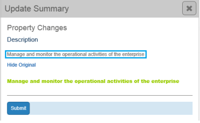 The Update Summary area presents a summary of the changes made using the Text Editor to the User. Clicking on the Show Original instruction will reveal the original state of the modified text.