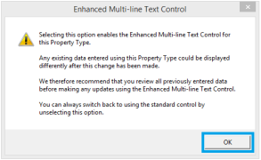 Selecting the Enhanced Multi-line Text Control check box will prompt a caution dialog box to display. After reading the message, click on the OK button.