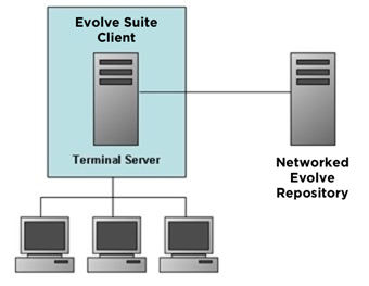 One copy of the Evolve Suite client software must be installed per terminal server machine, each of which runs Microsoft Terminal Services and is accessed by many users.
