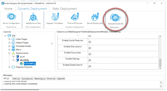 Recover Draft data from an Evolve model and MDB file. All Saved Web Modeler diagrams will be kept in the Evolve model. Exporting a model as MDB will also export Saved Drafts. The new option allows the drafts to be repopulated from any Evolve Model.