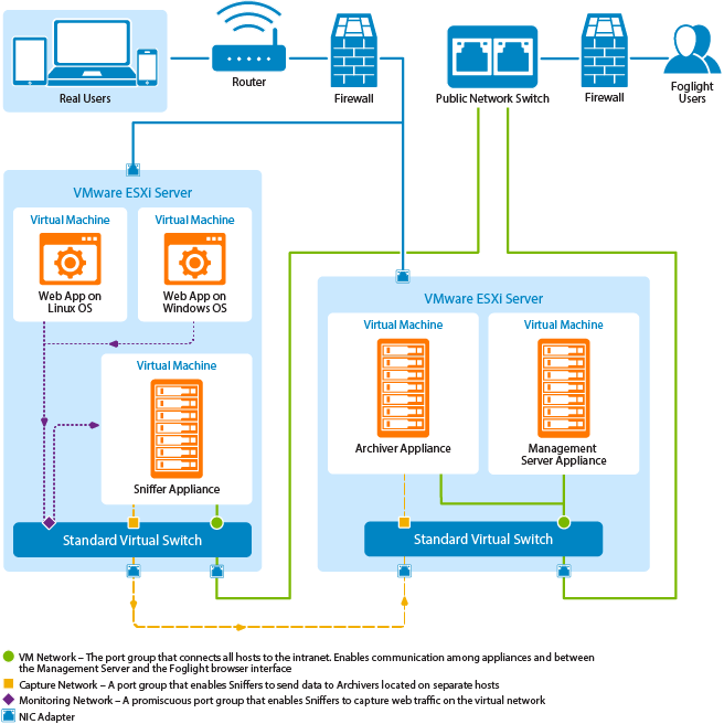 In this configuration, you install a Sniffer on the host you want to monitor, and install the Management Server and an Archiver on a separate dedicated ESXi® host. To connect the components to the virtual network and to each other, you need to define port groups on a standard virtual switch using either vSphere® or vCenter® Server. The following diagram shows the port groups and connections.