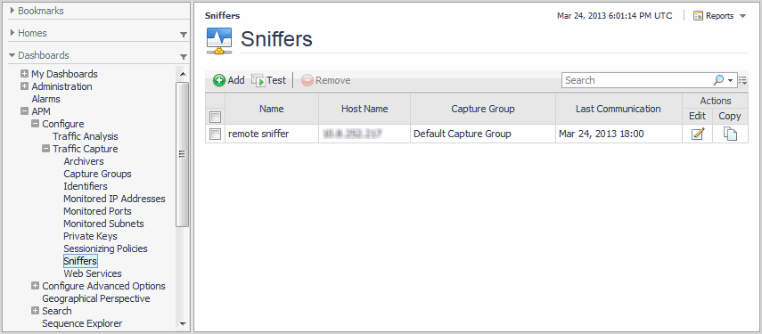 To define and manage Sniffers, navigate to APM > Configure > Traffic Capture > Sniffers.