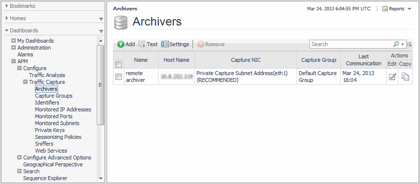 To define and manage Archivers, navigate to APM > Configure > Traffic Capture > Archivers.