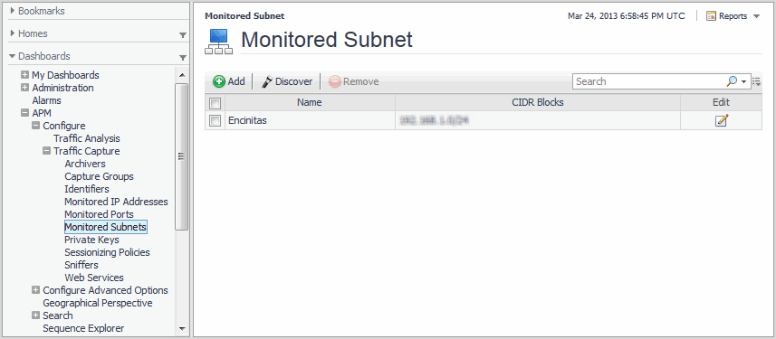 Specify the IP addresses that require private keys. In the Monitored IP Addresses dashboard, add IP addresses that use the HTTPS-enabled ports you specified. You only need to specify the IP addresses carrying secure traffic you are interested in decrypting. For more information, see Discovering IP addresses or Defining monitored IP addresses. |
