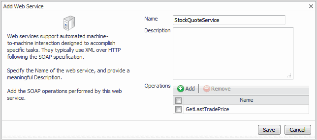 Click Add. Add a list of SOAP operations performed by the web service.