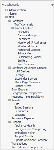 To find the Foglight APM dashboards, in the Foglight navigation panel, under Dashboards, expand APM. Top-level APM dashboards enable you to view aggregated data by sequence, transaction, or geographical perspective. The rest of the dashboards are organized into menu groupings that reflect configuration tasks, search activities, and support tasks.