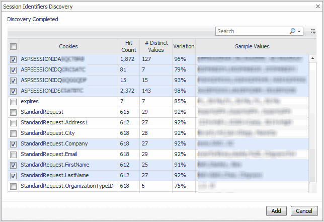 NOTE: ASP .NET® applications typically append numbers to the session identifier prefix aspsessionid. When you include the aspsessionid variable in a sessionizing policy (default behavior), Foglight automatically sessionizes all cookies that begin with the string aspsessionid. You do not need to add each numeric variation on aspsessionid as a separate entry.