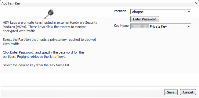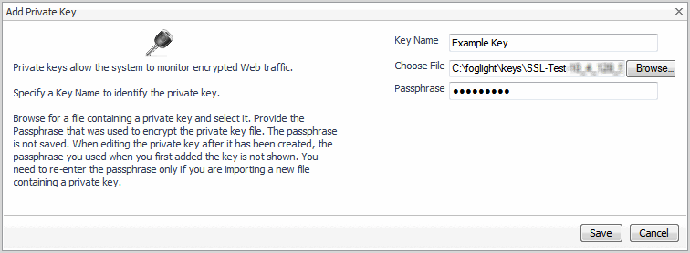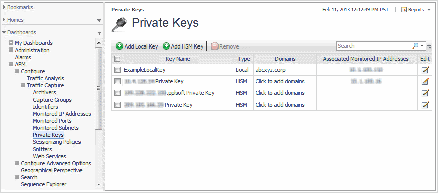 To load and manage private keys, navigate to APM > Configure > Traffic Capture > Private Keys.