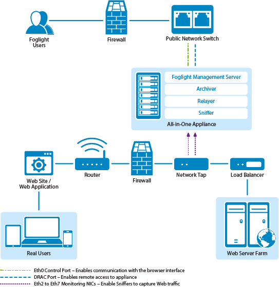 The software components can run on either Dell PowerEdge™ appliances or on virtual appliances hosted on a VMware® vSphere® Server. Typical installations usually require multiple components hosted on different appliances. To see diagrams representing larger monitoring solutions, see the Foglight APM Appliances Installation and Setup Guide.
