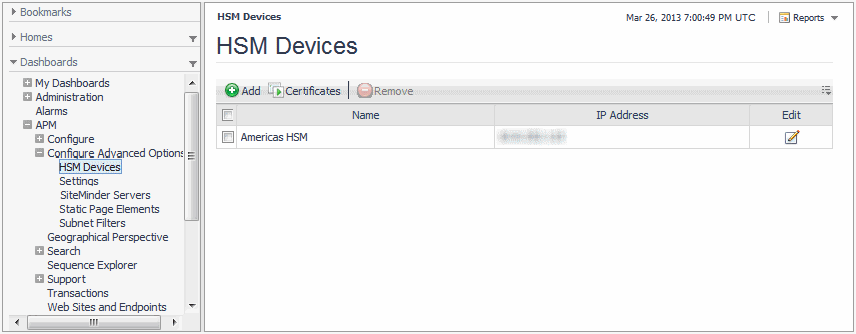 On the navigation panel, under Dashboards, click APM > Configure Advanced Options > HSM Devices.