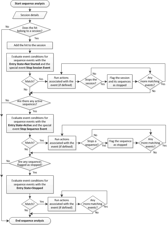 The analysis starts by evaluating events that can start sequences and end the session, that is, sequence events with an entry state of Not Started and the Stop Session Event special event. For each match, the Archiver runs the actions defined (if any) for the event. Typically, for a sequence event, this means starting a sequence, but it can also set the sequence status, set custom fields, and run scripts. If this hit matches an event that ends the session, the Stop Session flag is set as well as Stop Sequence flags for all active sequences within the session.