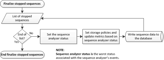 When the Stop Sequence flag is set for one or more sequences, the Archiver iterates through the list. For each stopped sequence, it sets the sequence analyzer status, sets storage policies and updates metrics based on the sequence analyzer status, and writes the sequence data to the database.