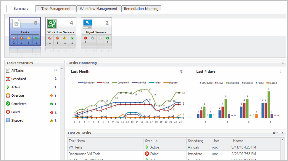 The Tasks Summary contains two view: Task Statistics and Task Monitoring. The Tasks Statistics view lists task categories. To view the tasks for a particular category, click the category in the list. The summary information about the tasks of the selected category appears in the Tasks Monitoring view. You can see the task execution statistics for either the last month or the last 4 hours.