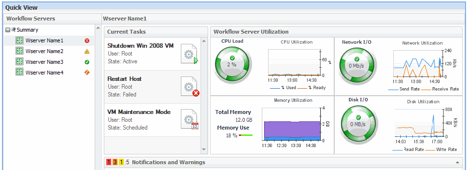 The Workflow Servers Summary contains two views: Workflow Servers and Summary. The Summary view on the right changes depending on the selection in the Workflow Servers list on the left. Select a workflow server from the list to view its utilization statistics in the Details view.