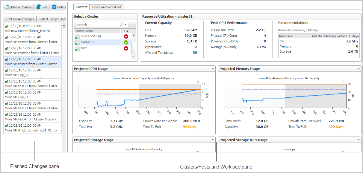 The Clusters/Hosts pane displays the details related to the selected virtual center or datacenter. This information is automatically updated when the Slot Size settings are modified and when including/applying planned changes. For more information, see Calculating Slot Size Based on VM and Calculating Slot Size Using Custom Size .