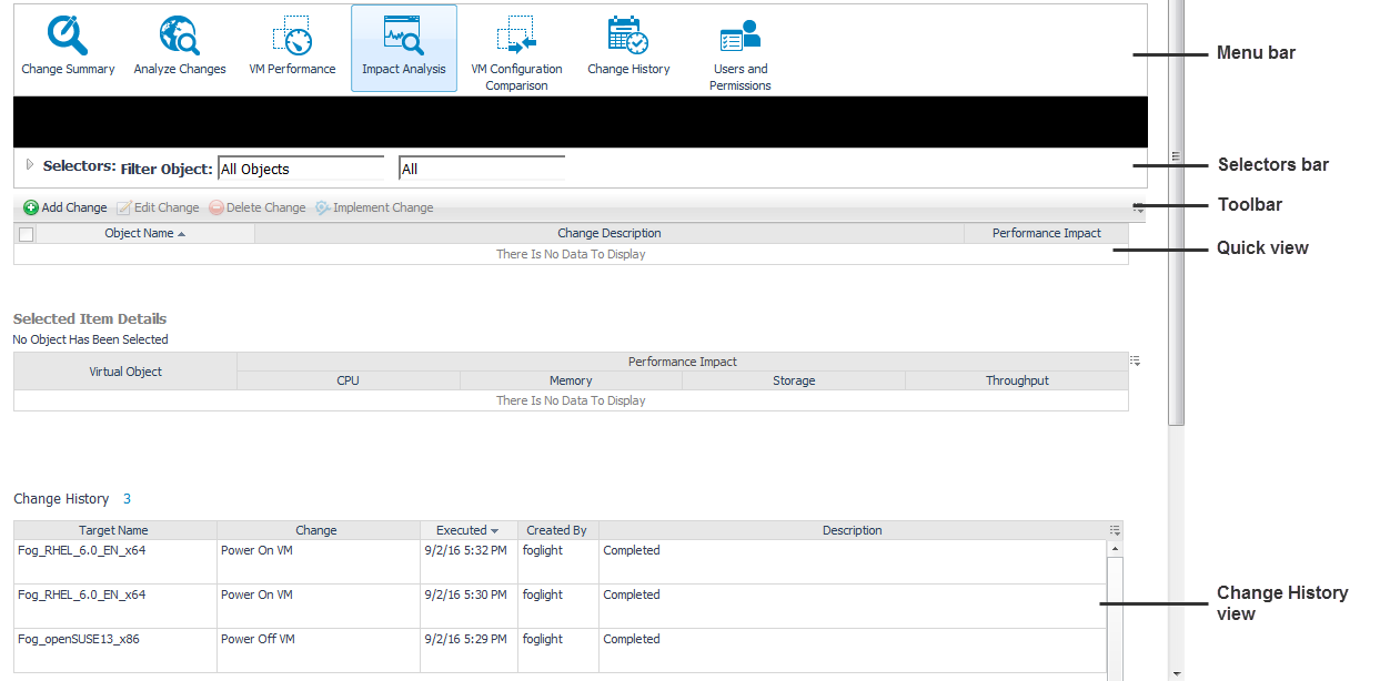 The Impact Analysis view allows you to define a sequence of changes and see what impact those changes have on your system’s performance. It also allows you to trigger the execution of these changes immediately or schedule these changes within Foglight, Foglight for Virtualization, Enterprise Edition, or Foglight Evolve. The Change History embedded view displays the history of changes implemented using the Impact Analysis functionality. For detailed information about how the performance impact is calculated, see Performance impact assessment.