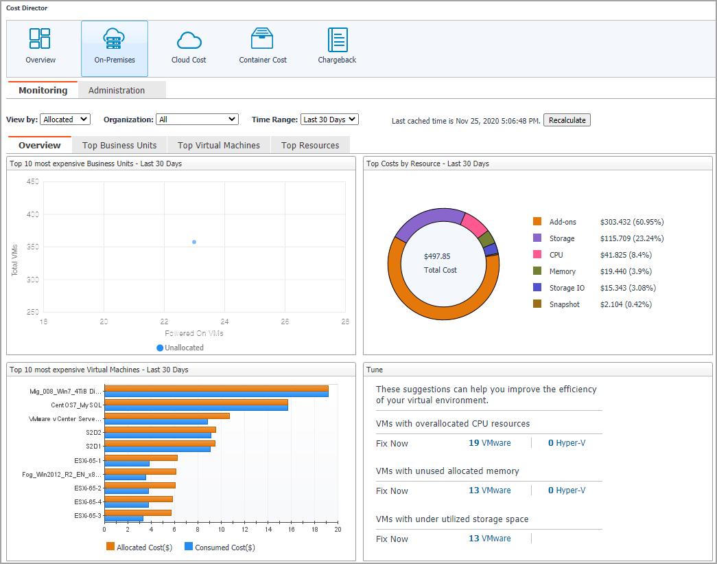 The On-Premises dashboard displays the statistic total cost of organizations, business units, and virtual machines in the last 7/30/90 days. Metrics and charts in this tab will be updated every day or you could click the Recalculate button to manually update all charts. To access this dashboard, under Homes, click Cost Director.