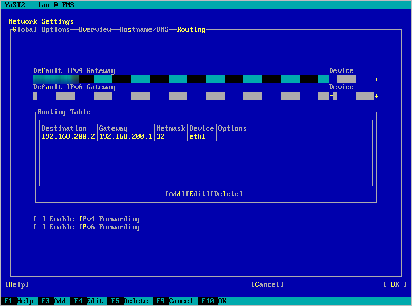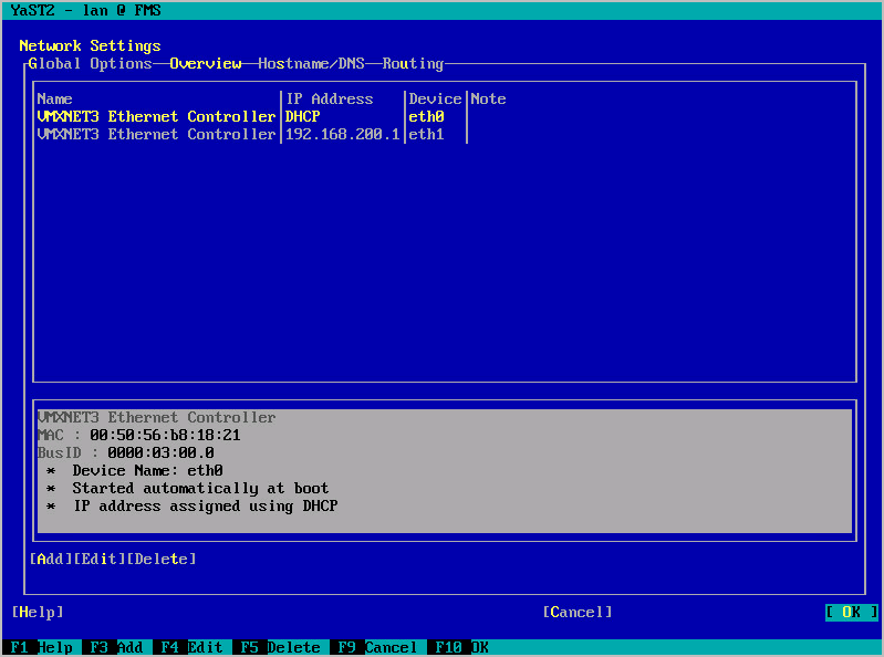 Both FMS and DBS VMs have two NICs — one for communication to the outside and one just for communication to each other. The two NICs that communicate between the VMs have static IPs that should not be changed (192.168.200.1 and 192.168.200.2, respectively).