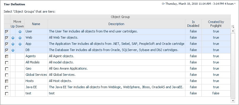 Use the Tier Definitions dashboard to associate an object group to a tier. A tier is another logical component that references one or more object groups, based on some common criteria. This type of logical structure helps you investigate performance problems associated with multiple objects. For example, to investigate the state of the monitored components within a tier, drill down on a tier and investigate the hosts that are related to it. For more information about services, see the Foglight User Guide.